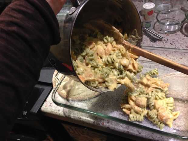 Ahora debe tener una olla de macarrones y un pote de salsa cheesey. Vierta en la olla más pequeña en la olla más grande que sea (por ejemplo que la salsa es en el bote más pequeño, para a verter la salsa en la olla con la pasta). Si parece demasiado pequeño, puede conseguir un recipiente grande y ponga el contenido de ambos botes en un bol.