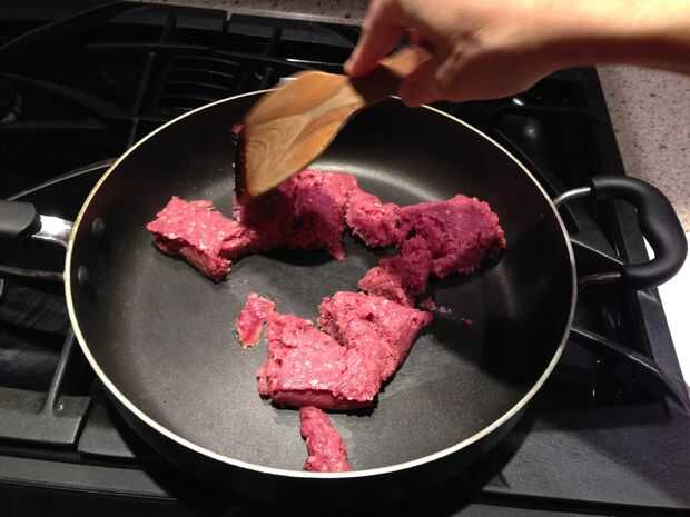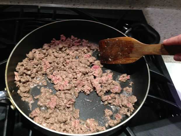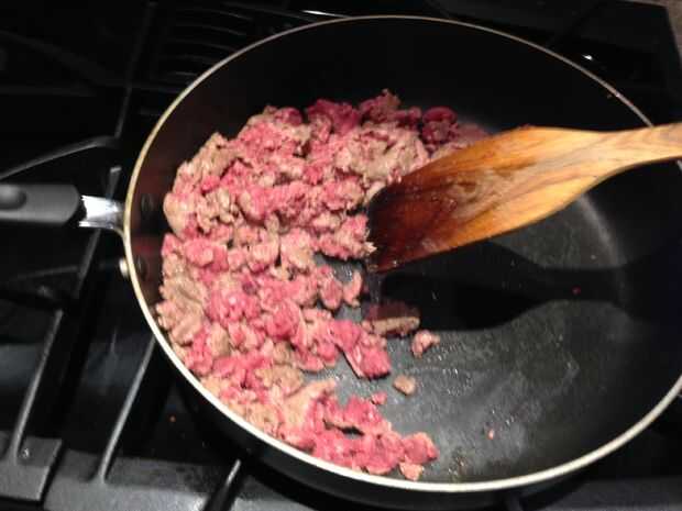 A medida que el pan se caliente, se oye su inicio de carne chisporroteando. Es una buena señal! Con la espátula, mantenga dividir la carne en pequeños trozos y revolver todo para que todos lados empiezan a dorarse.