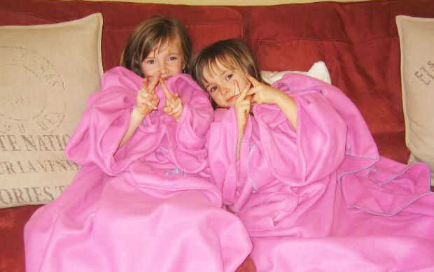 Si es extra agradables, podría agregar un bolsillo delantero a la parte delantera de la parte delantera de la snuggie.  Estas señoras poco tienen sus iniciales con monograma en sus bolsillos (hechos simple por el cantante Futura CE-250) así que no habrá ninguna confusión sobre que es lo que.  Usted podría agregar parches personalizados o múltiples bolsillos - las opciones son infinitas!