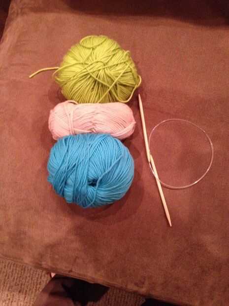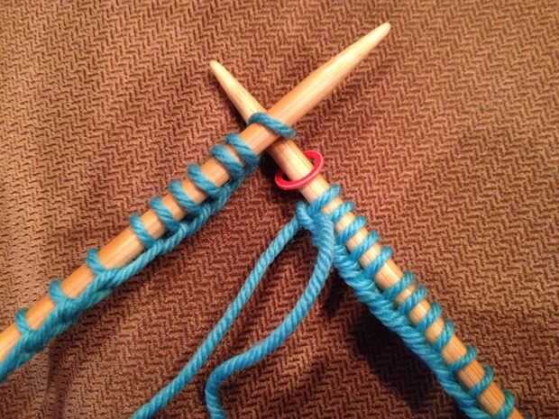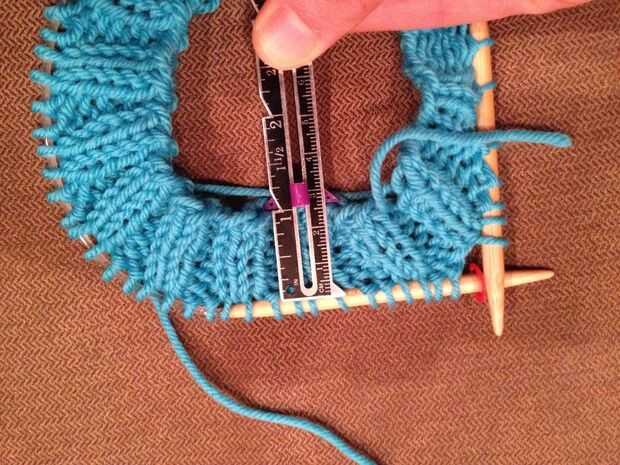 Utilizando azul peso peinada hilo y una aguja circular de 9 pulgadas de tamaño 9, sobre 56 puntos (o cualquier múltiplo de 8, si quieres un tamaño más grande). Coloque un marcador y Únete en la ronda. Hilo azul y en patrón de punto elástico (punto 2, derecho 2) alrededor hasta que la pieza mide 1 pulgada de fundido en el borde.