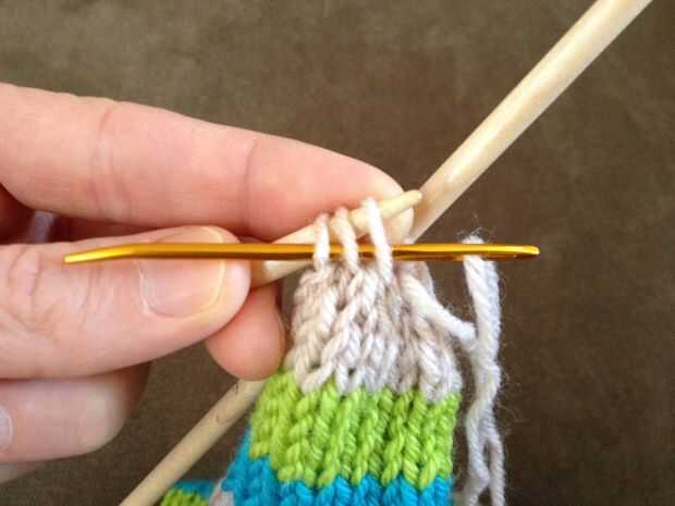 En azul, punto 1, punto 2 juntos y repetir hasta el final de ronda. Luego tejer 3 filas.