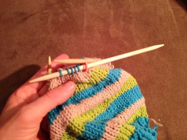 En verde, punto 2, tejer 2 juntos y repetir hasta el final de ronda. Luego tejer 3 filas.