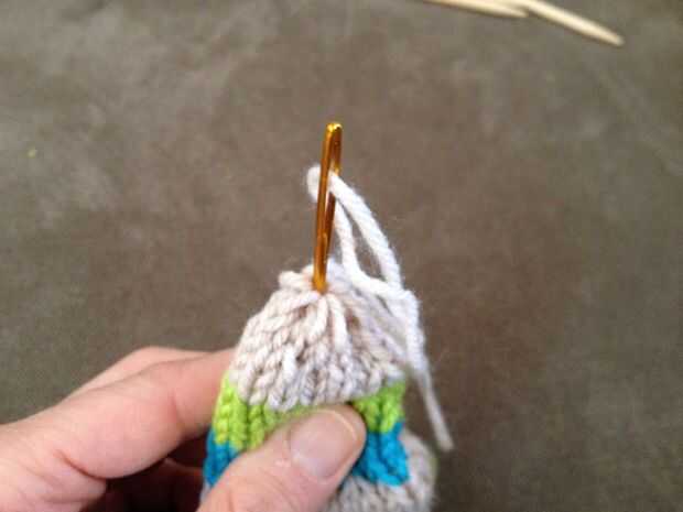 En blanco, 3 hileras de punto. Luego tejer 2 juntos, repetir hasta el final de ronda. Cortar hilo y una aguja de hilo para tire hacia arriba el extremo a través de los restantes puntos de sutura en la aguja. Utilizando una aguja de hilo, tomar el extremo suelto para dentro del sombrero a través de la pequeña abertura en la parte superior.