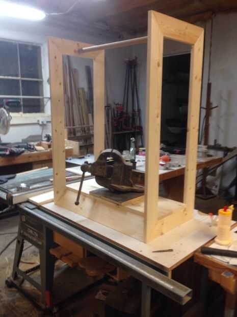 El estante inferior se encuentra dentro de la parte inferior de la trama vertical. La barra es simplemente una barra de ropa madera normal, cada extremo es empotrado en el marco, pegar, así como atornillado desde el exterior del marco. Ya era bastante fuerte en este punto. La prensa grande sentado en el medio es sólo peso para mantener la ayuda media por debajo en el lugar mientras el pegamento seca.