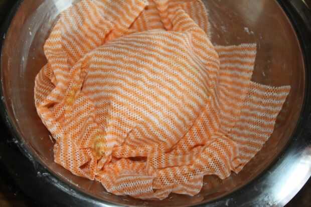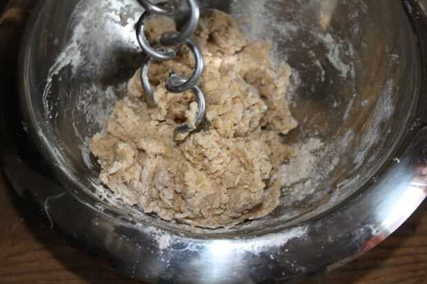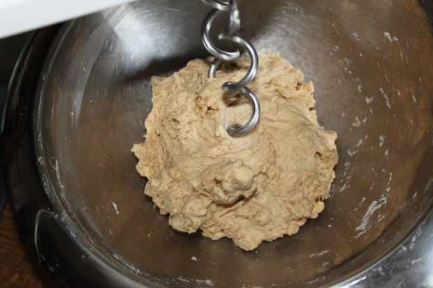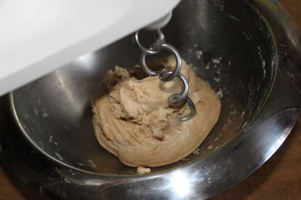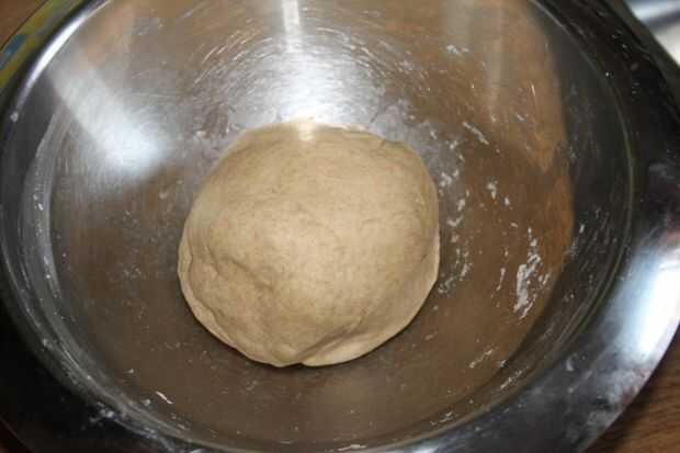 Revolver con una batidora de mano gancho de amasar. En primer lugar brevemente en la posición más baja, entonces en la posición más alta durante unos 5-7 minutos para formar una masa suave. Rodar una bola, cubrir la masa con un paño húmedo suave y poner en un lugar cálido a elevarse hasta que visiblemente ha aumentado en volumen. La dejé cerca de la estufa durante una hora.