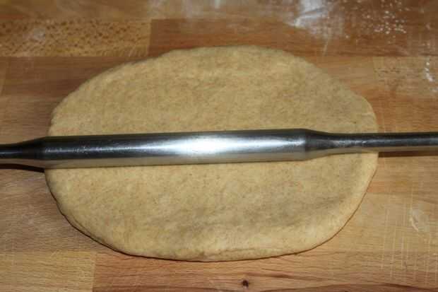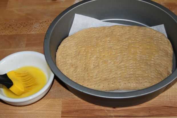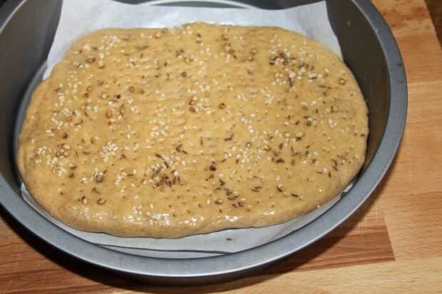 Cuando visiblemente se incrementa en volumen, amasar otra vez brevemente en una superficie de trabajo ligeramente enharinada. Estirar la masa en un plano oval shapes.3/4 pulgadas de espesor. Ahora coloca la masa en una bandeja de horno preparada y pinchar varias veces con el tenedor. Derretir la mantequilla y unte la masa con ella. Inmediatamente espolvorear semillas de sésamo, cilantro y comino sobre él. (No he espolvoreado semillas de amapola) Nuevamente cubrir la masa con film transparente y dejar en un lugar cálido hasta que visiblemente ha aumentado de tamaño. Lo dejé durante una hora. Consulte la figura 4 (antes) y cuadro 5. (después de una hora se ha incrementado en volumen)