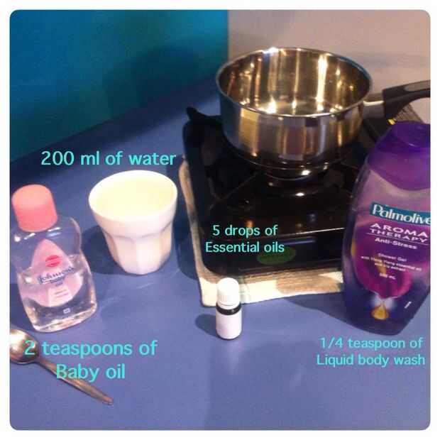En su cacerola ponga 200ml de agua, 2 cucharaditas de aceite de bebé, 1/4 de una cucharadita de bodywash y 5 gotas de aceites esenciales.