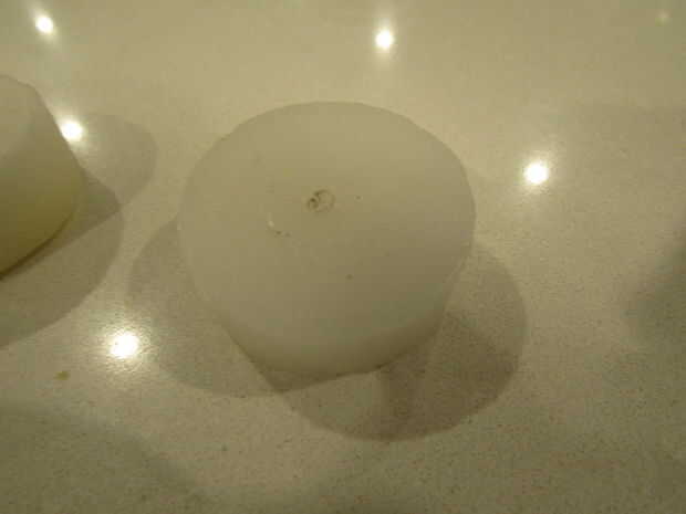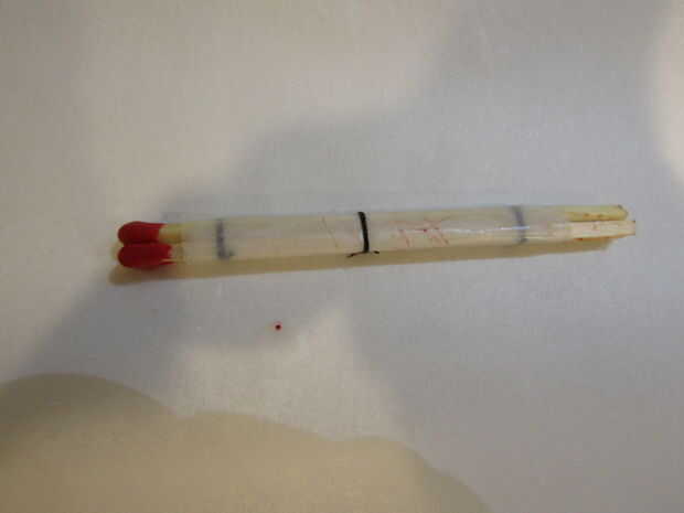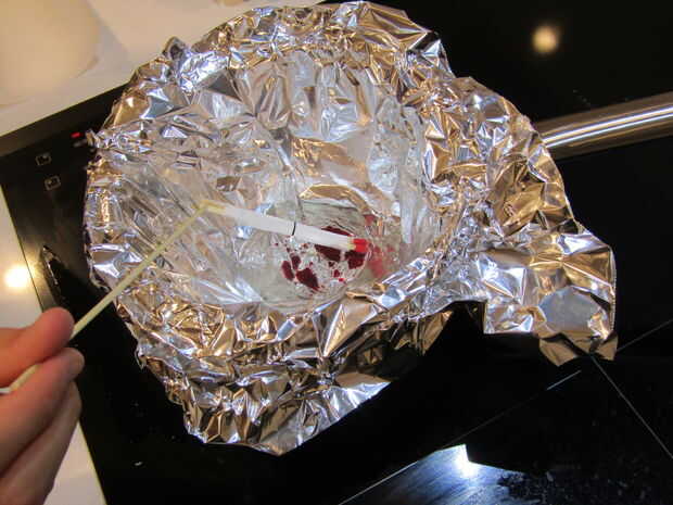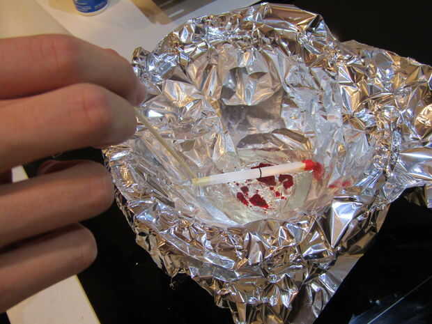 Retire las mechas o partes metálicas de las velas. Para acelerar la fusión proceso cortar las velas en trozos más pequeños. No te preocupes lo rojo en la parte inferior, es colorante alimenticio único. Y siento que la tercera foto es un poco difusa de vapor. Ahora sumergen a los fósforos en la cera. Asomó un pincho de bambú en los partidos para que no queme los dedos. NO TOQUE LA CERA FUNDIDA, QUE ES MUY CALIENTE. HABLANDO DE EXPERIENCIA. Asegúrese de que obtener el completo partido empapado en cera. Ahora que al partido seco