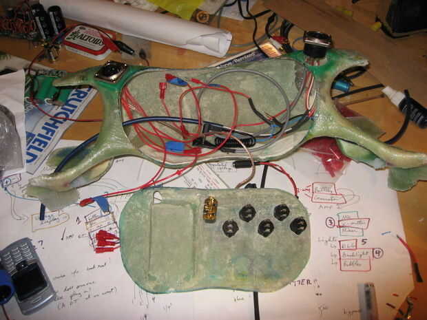 El paso de cableado también abarca llegando con elegantes formas de pasar los cables en la música del gabinete. En este punto en mi proyecto, me metía un fuerte ambiente de peces tropicales de la forma de gabinete. Así que he decidido acentuar pasando los cables dentro del gabinete cerca de la 'boca' de la forma para darle un aspecto de barba.