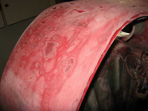 Una capa de gel es básicamente una capa de epoxy thicked que no incluye fibra de vidrio. Pintar o manchar en la fibra de vidrio. Luego 24 horas más tarde, lije lo. En mi caso repetí este procedimiento 3 veces. En la foto se puede ver que en unos lugares, estaba lijado todo el camino a través de la capa de gel a las fibras de la fibra de vidrio. Esto es un no-no, puesto que significa que son sacrificar resistencia. Si no estás satisfechos con la curva aún y está lijado hacia abajo a las fibras, hay que añadir más gel coat, repita el proceso de lijado.