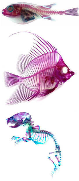 Luego pinté el pescado, usando un compresor de aire. Mi idea era dejar con estos colores, descubierto en mi investigación sobre el esqueleto de pescado. Esta imagen fue obtenida con un contraste químico introducido los peces antes de realizar una exploración. El efecto es muy bonito. Más oscuro que los contornos en el centro. La iluminación en el teatro le dará el efecto de este contraste.
