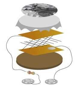 Capa de las piezas como se muestra en la figura. Yo empezaría por tomar las dos piezas de cobre de la hoja y colocar la malla en el medio. Este es el interruptor! Presionando el botón comprimir las capas y hacer que las capas de cobre al tacto, cerrando el circuito. Cuando el botón no es presionado, el acoplamiento entre las capas de alambre de cobre se asegurará de que estén separados y que el circuito permanece abierto (también he visto esta hecha con capas de papel de aluminio separados por pajas si no tienes cobre de la hoja y por parte de la malla. También, me imagino que la cinta conductora funcionaría tan bien como la lámina de cobre).
