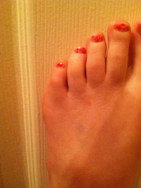 Ahora toma tu esmalte de uñas coral y su pequeño cepillo. DIP el pequeño pincel en el esmalte de uñas aplica a cada dedo excepto grande hacer esto en ambos pies. Una vez que se seca y que has puesto tus lunares en ambos pies dejar secar y añadir otra capa de transparente para protección adicional (opcional)