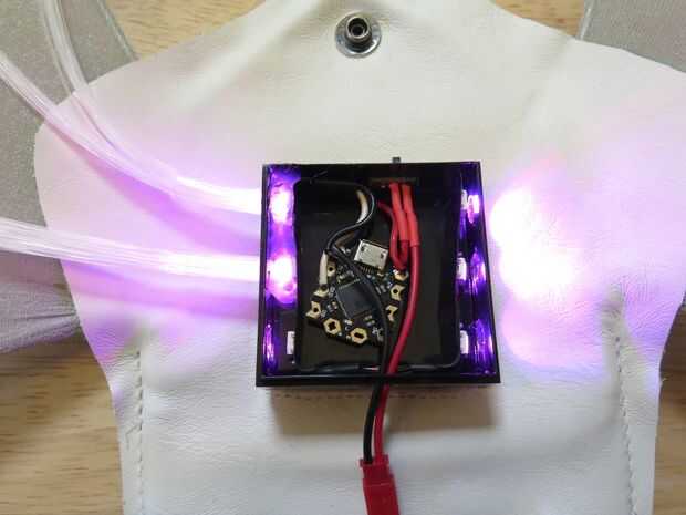 Jenn Mann quién también hace increíble fibra ópticas wearables, ha encontrado una manera de utilizar capas de láser corta acrílico para crear una franja de conexión semejantemente formada entre LEDs y fibras.
