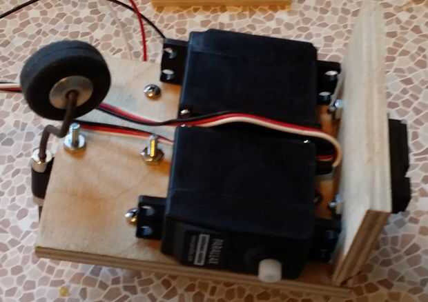 Con los servos y el chasis del robot ya terminado, pegue los servos en la parte inferior de la base como se muestra en la imagen.