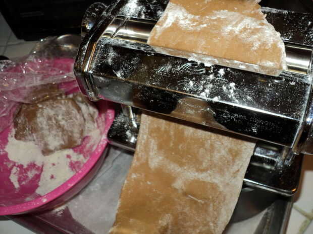 Empiece en el más amplio ajuste de rodillo y poco a poco la pasta para una piel fina. Fui a 6 en mi máquina. No era papel fino pero pasta se expande un poco al cocinarse.