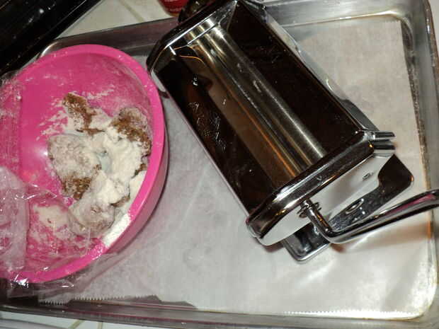 Cortar la bola de masa en trozos más pequeños. Cuando se trabaja la masa a través de la máquina de pasta, puede conseguir inmanejable. Tiras largas sólo manojo hacia arriba.