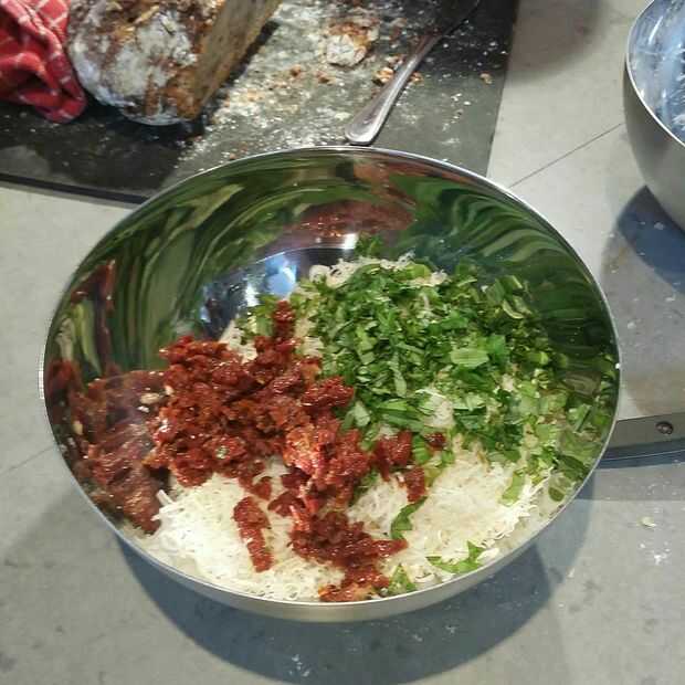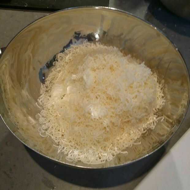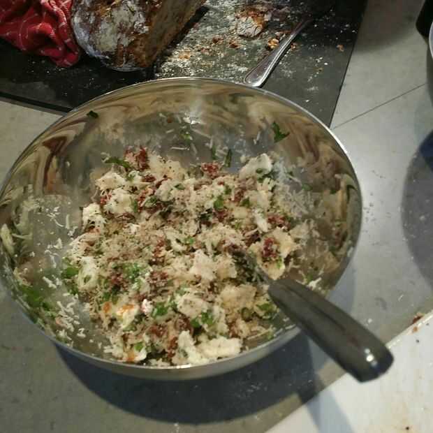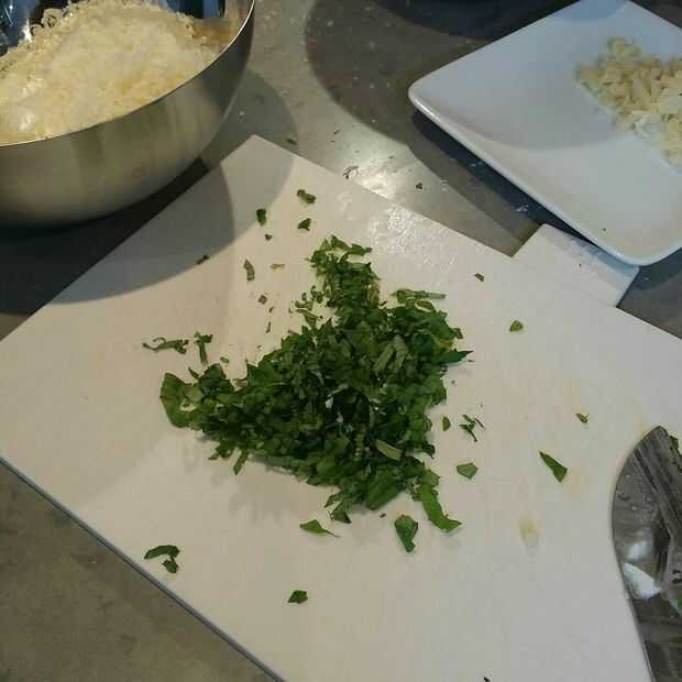 Reducir los ingredientes a pis verde tamaño trozos. La mayor parte del parmesano de la rejilla pero guardar algunas para decorar. Todo a un bol y añadir un montón de pimienta. Sin sal en este momento!