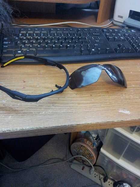 A continuación encontrar el par más grande de gafas de sol en que puede conseguir sus manos. Elegir el tipo fotografiado de arriba porque tenían un poco más largo en los lados de los lentes redondos. Tomé las gafas de sol aparte y poner pegamento caliente dentro del casco alrededor de los bordes de los agujeros del ojo. A continuación, ponga el lado brillante de las lentes externas dentro del casco y pegadas en su lugar. Asegúrese de mirar los agujeros del ojo desde el exterior del casco para asegurarse de que su cubierta de lentes el ojo todo agujero arriba. Recuerde revisar los lentes con los agujeros del ojo. Al empezar a cortar los agujeros del ojo de la placa, asegúrese de que dejar suficiente espacio dentro de los agujeros del ojo para sus lentes pegar contra.