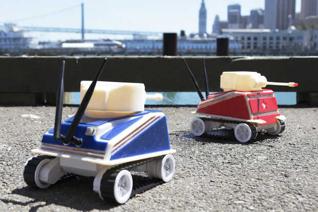Luchar contra a tus amigos con estos robots de batalla con procesador Intel. Esta pequeña explosión de bots con arroja a chorros de agua y detectar golpes con sensores de agua alineados a lo largo de sus cuerpos. Cada bot es alimentado por una placa Intel Galileo y controlado inalámbricamente con firmware ConnectAnyThing.