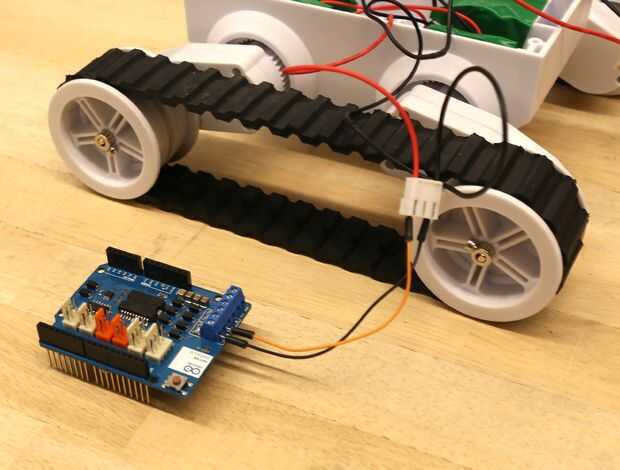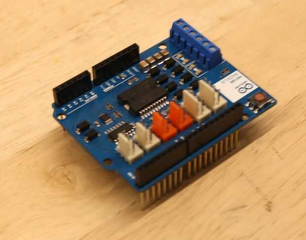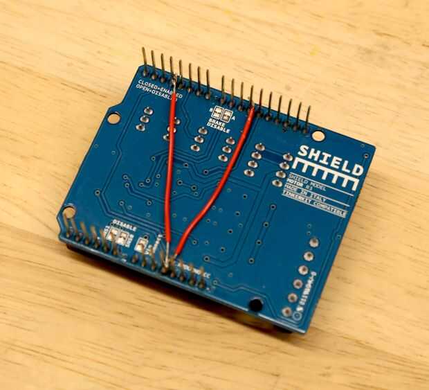 El protoboard está montado sobre un escudo del motor Arduino. Los pines PWM 3 y 11 controlan de la velocidad del motor. La soldadura de los cables de los pines 3 y 11 a 5V para que los servos se mueven a velocidad máxima. Hay dos servos en el chasis del robot, cada uno con una conexión a la alimentación y tierra. Conecte los cables rojo (+) canal A en el escudo y terminales B y los cables negros para el canal (-) A B bornes.