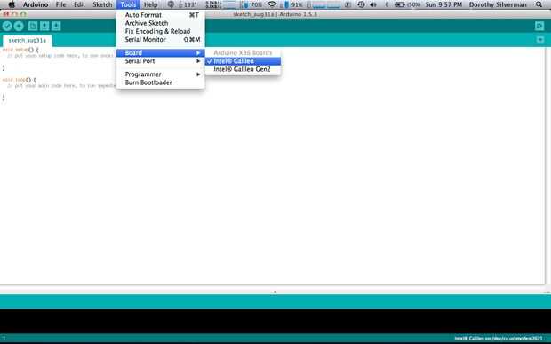 - Abra el IDE y en "Herramientas" -> "Tablero de" elegir "Intel de Galileo"