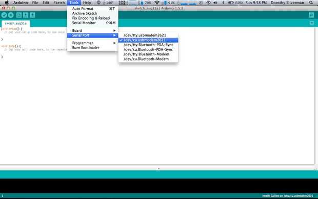 - En "Herramientas" -> "Puerto serie" elegir el cuento por entregas portuario "/ dev/cu /..." (significado no utiliza un puerto "/ dev/tty /...". No funcionará).