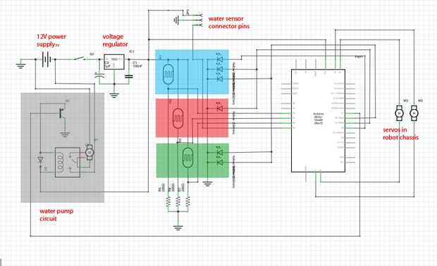 - Los servos y bomba requieren más potencia que puede ofrecer solo Galileo, razón por la cual usé una batería externa de 12V. Cierta energía es enviada a través de un lm2596 (conmutación dc-dc buck convertidor) a rampa hasta 5V para alimentar los servos y conectar con el resto del circuito. Un conmutación paso conversor es más eficiente que un regulador de voltaje lineal. No pierde tanta energía al calor porque es cambiar constantemente.