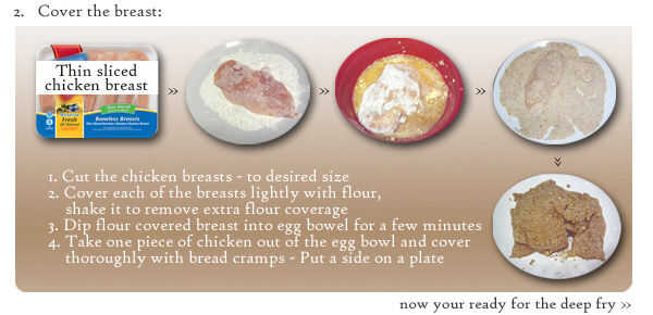 4. Tome un pedazo de pollo fuera del tazón de fuente de huevo y cubierta con pan calambres
