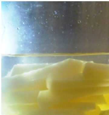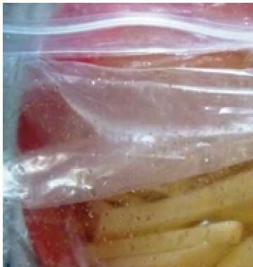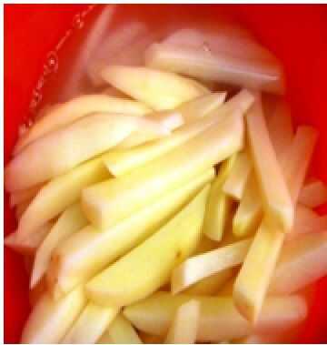 Combinar 4 cucharadas de sal con 4 tazas de agua en un recipiente. Vierta la mitad de la solución de la salmuera en una de las bolsas de reasealable que contienen bastones de patatas en rodajas. Verter la otra mitad restante de la solución de salmuera en el segundo otro bolso.