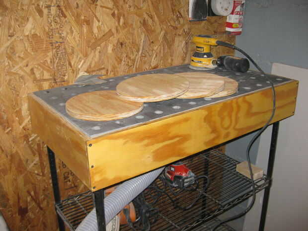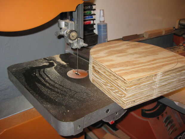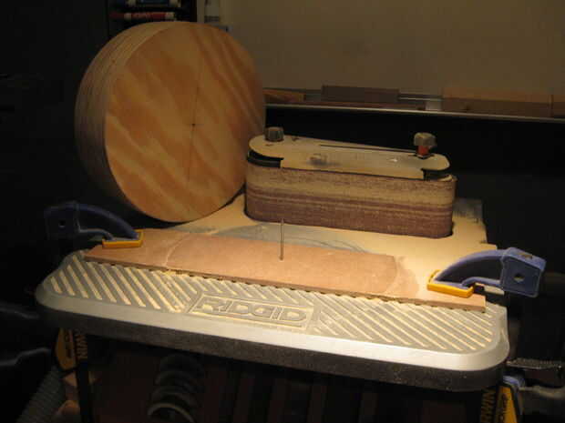 La forma aproximada era cortar en la Sierra de cinta. Para los discos de la arena en un verdadero círculo utilicé un trozo de cartón y un 3" clavos finales. Las uñas es el pivote de centro y como tomar la luz pasa y eres paciente, este método tiene resultados fantásticos. No tengo una lijadora de disco en este momento, por lo que la lijadora de banda oscilante fue la herramienta de elección.