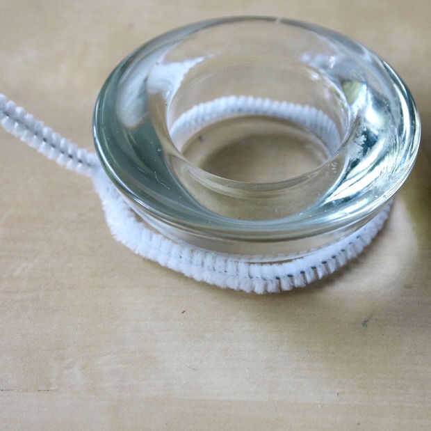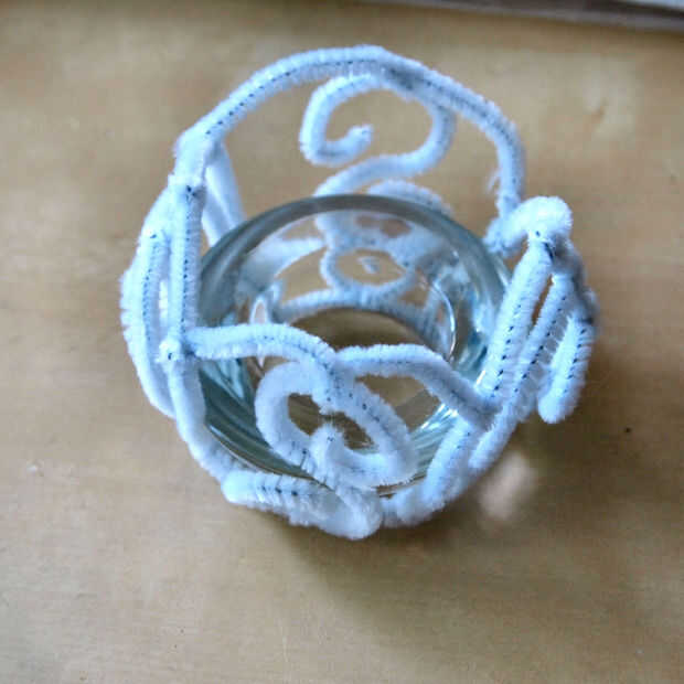 Crear el marco de su sostenedor de vela con los limpiapipas. Utilizar bucles, espirales, ochos de figura o probar algo diferente en el diseño de su marco. Compruebe que se ajusta alrededor de su sostenedor ligero del té de vidrio. Tenga en cuenta que cuando la forma de cristales el diámetro del tubo limpiador duplica aproximadamente.