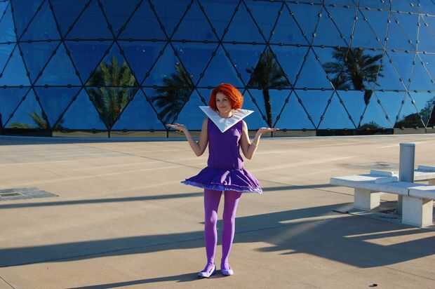 Comencé con mi propio traje, Jane Jetson. Decidí hacer el traje de una falda y un top sin mangas en lugar de un vestido. Tomé mis medidas y dibujó mi propio patrón para un superior. Cortar las piezas de 2 yardas de tela de color púrpura oscurezca, les cubrió juntos y comenzó a coser. Añadido botones abajo de la parte posterior para un mejor ajuste, también lo que es más fácil de subir y bajar. Luego vi un video de YouTube en la fabricación de faldas de círculo para hacer un patrón para la falda. Hice la falda de dos capas, la capa superior es el mismo tono que la parte superior sin mangas. La capa inferior es dos pulgadas más grande que la capa superior de la falda. He añadido fino elástico a la cintura, conecta ambas capas de la falda. Dobladillo de la parte inferior de ambas capas de la falda, dejando un espacio para agregar alambre a ambos dobladillos para un look de Falda acampanada de aro. Una vez que añadí suficiente cable para conseguir el aspecto que deseaba, envuelve los extremos juntos y pato les grabó y luego había cosido el resto del dobladillo.