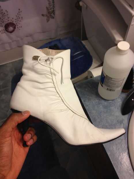 Según el material del zapato, puede variar su preparación. Para estos tacones de cuero, primera preparación fue hecha con deglazing el cuero, pero utilizando acetona para quitar la capa de esmalte/ceroso. Esto se puede hacer frotando los zapatos con bolas de algodón humedecidos con acetona. En la mayoría de los casos será suficiente 'removedor del pulimento de clavo', como es acetona diluido.