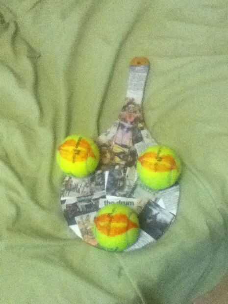 I decoradas con recortes de periódicos. He pegado con pegamento para madera para el bate de ping pong y ponerlo a un lado se seque durante al menos una hora