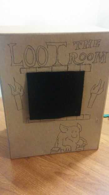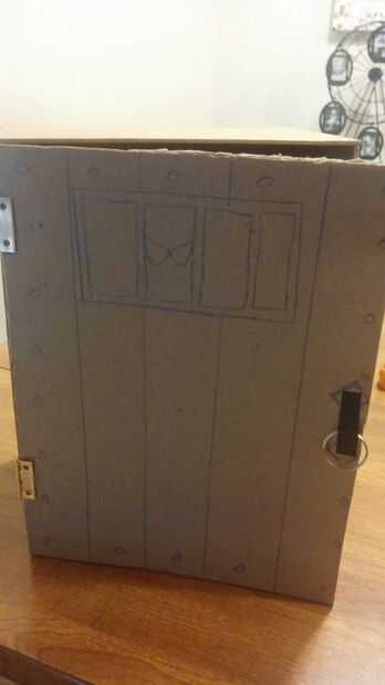 Para el sostenedor de la forma de la puerta, utiliza la caja de cartón y cortar la tapa para crear la puerta. Luego, simplemente atamos esta pegando encendido con pequeñas bisagras. También cortamos un agujero en la parte posterior que permiten dibujar una tarjeta sin los demás jugadores viendo la tarjeta ser dibujada. Para hacer más interesante de la creación, queríamos que las cartas a mover cuando abre la puerta. Utilizamos la cartulina sobrante desde la creación de la puerta a un pequeño soporte que levantaría las tarjetas cuando se abre la puerta a través de una cadena (esto se puede ver en fotos más adelante).