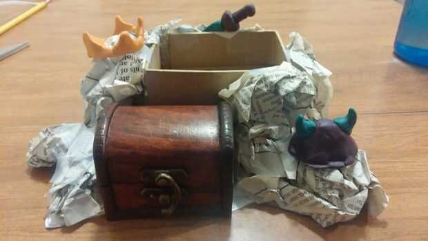 Para el sostenedor de la pila del tesoro, formamos la estructura básica con una caja de cartón que estaba entonces cubierta de papel maché.