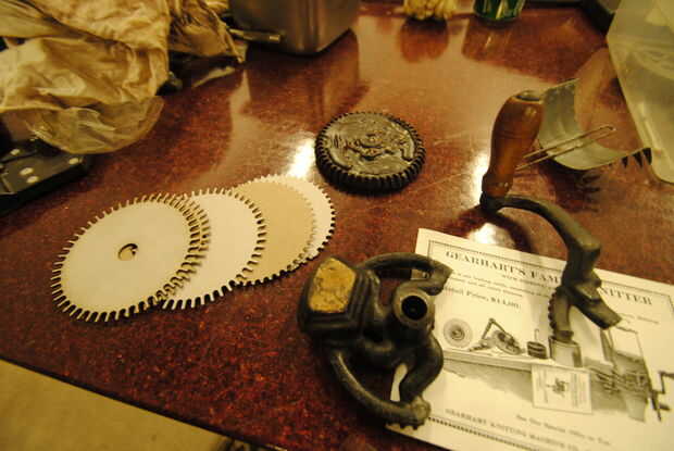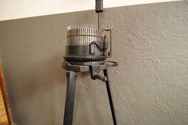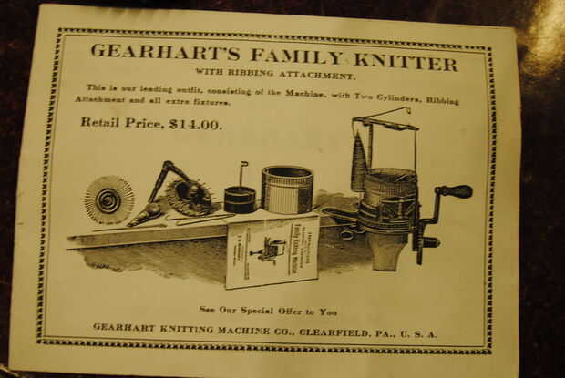 Compré una máquina de tejer de Gearhart antigua de $100 que dice 1908 sobre el bastidor y 1914 en las instrucciones. Esta cosa es la máquina más que tengo. Me inspira para observar cómo las cosas fueron tan cuidadosamente y hábilmente diseñadas y construidas. Hoy en día parece que no tenemos ese tipo de tiempo o atención o cuidado. La historia de estas tejedoras de calcetines poco es extraordinaria, sobre todo porque ayudó a Estados Unidos a ganar WWI! Antes de su invención la gente hacer punto calcetines a mano - un par de días. Un operador experto puede hacer un par de esto en unos 40 minutos. Combatientes de la WWI sufrían de trinchera pie causado por haber mojado los pies continuamente, literalmente perder la vida. Las mujeres en Estados Unidos recibieron máquinas gratis si punto un número de calcetines para las tropas, reduciendo así el pie de foso, gangrena y contribuido significativamente con el esfuerzo de guerra. Supuestamente hicieron unos 200.000 de estos tejedores.