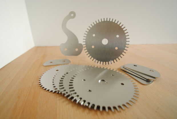 Elaboró los engranajes en 2D y dos longitudes de diferentes dientes en calibre 16 acero inoxidable a apilarse para crear un bisel de aproximadamente. Puse 1/4" 20 taladro grifo tamaño agujeros en las piezas por lo que sólo pude golpee la pila mientras sujeta en un tornillo de banco y toda la cosa perno juntos. Trabajó como un encanto a pesar de rompe un grifo y tuvo que hacer unos agujeros nuevos.