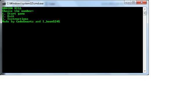 off:menu color 0a cls echo DRAGON KILL echo Choose the number: echo 1. Start game echo 2. Exit echo 3. Instructions echo Made by CodeSmartz and I_boom5245 set /p menu= if '%menu%'=='1' ( goto sets ) if '%menu%'=='2' ( exit ) if '%menu%'=='3' ( goto instruct )else goto menu :sets cls echo Hello! What is your name? (one word) set /p name= if '%name%'=='batchfileuser' ( goto Eastereggone ) set /a money=1000 set /a health=1000 set /a potions=0 set /a damage=2 set /a dd=5 set /a dh=25 set /a moneygain=50 set /a levels=0 set /a new=%dh%+5 set /a buy=0 set /a dragon=0 set /a five=0 set /a avail=0 :start cls echo %name%'s money:%money% echo %name%'s health:%health% echo Number of healing potions:%potions% echo Choose the number: echo 1. Venture onward to the dragon echo 2. Go to Store echo 3. Go to Title screen echo 4. Drink heal potion echo 5. See Achievements set /p choose= if '%choose%'=='1' ( goto fight ) if '%choose%'=='2' ( goto store ) if '%choose%'=='3' ( goto menu ) if '%choose%'=='4' ( goto nextx ) if '%choose%'=='5' ( goto trophies ) if '%choose%'=='money' ( goto eastereggtwo )else goto start :fight cls echo Health:%health% echo Dragon's Health:%new% echo You have encountered a dragon pause cls echo Press enter to hit the dragon set /p hit= set /a new=%new%-%damage% if %new% LSS 1 ( goto defeat ) cls echo Health:%health% echo Dragon's Health:%new% echo You have hit the dragon echo The dragon lost %damage% health pause cls echo The dragon has hit you! set /a health=%health%-%dd% if %health% LSS 1 ( goto defeated ) pause cls goto fight :defeat cls set /a dh=%dh%+20 set /a new=%dh% set /a money=%money%+%moneygain% set /a levels=%levels%+1 set /a dragon=1 if %levels%==5 ( set /a five=1 ) echo You defeated the dragon and earned $50 . echo Congratz ping localhost -n 5 >nul pause goto start :defeated cls echo Sorry %name% but you died!!!!!!!!!!!!!!!!!!!!!!!!!!!!!!!!! echo RIP echo You have killed %levels% dragons ping localhost -n 5 >nul pause goto menu :store cls echo Money:%money% echo Welcome to the store! echo Choose: echo 1.Sword Upgrade $700 echo 2.Heal Potion $30 echo 3.Leave Store set /p again= if '%again%'=='1' ( goto buysword ) if '%again%'=='2' ( goto buyheal ) if '%again%'=='3' ( goto start )else goto store:buysword cls set /a money=%money%-700 if %money% LSS 0 ( echo You cant buy that! set /a money=%money%+700 pause goto store )else ( set /a damage=%damage%+4 set /a buy=1 echo You have upgraded your sword pause goto store ) :buyheal cls set /a money=%money%-30 if %money% LSS 0 ( echo You cant buy that! set /a money=%money%+30 pause goto store )else ( set /a buy=1 set /a potions=%potions%+1 echo You have bought one heal potion pause goto store ) :nextx cls if %potions%==0 ( echo Sorry. You dont have any potions. pause goto start )else ( set /a health=%health%+15 set /a potions=%potions%-1 echo You have used one potion pause goto start ) :instruct cls echo When you start you will see the amount of money and health you have. echo There will be a list of things you can do: echo 1. Venture onward to dragon echo 2. Go to Store echo 3. Go to Title Screen echo 4. Drink health potion pause cls echo You will choose one echo Your goal of the game is to fight dragons until you die pause cls echo Lastly there are many easter eggs echo All easter eggs are one word . . . . echo Hint: Everything you have to type in this game will only be one word echo DO NOT type any spaces in this game. . . . echo GOOD LUCK pause goto menu :Eastereggone cls echo Easter Egg echo You have typed in your name as batchfileuser echo batchfileuser is my typical Video Game Account Username therefore you will be rewarded $2000 set /a money=%money%+2000 pause goto start :eastereggtwo cls set /a avail=%avail%+1if %avail% LSS 2 ( echo You have discovered an easter egg. echo +10000 money set /a money=%money%+10000 pause goto start )else goto no :no cls echo You have already found this easter egg pause goto start :trophies cls echo If the achievement says '1' that means you completed it. echo If the achievement says '0' that means you have not completed it. echo Killed a dragon: %dragon% echo Buy Something: %buy% echo Kill Five Dragons: %five% echo. echo. echo Note: Everytime you restart the game, your progress resets pause goto start