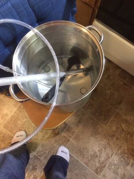 4. una vez que todo está desinfectado, tome la manguera de sifón y gancho hasta el sifón. Después de que éstos están conectados, conecte el tubo de embotellado al otro extremo de la manguera de sifón.