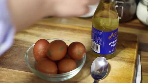 A esto le añadimos un chorrito de vinagre de vino blanco, no demasiado los huevos tendrán un sabor ácido y no queremos eso. Realmente realmente no necesita el vinagre si los huevos son muy frescos (como en alrededor de 1 día de edad) pero el vinagre estabiliza las claras y no duele al usarlo.