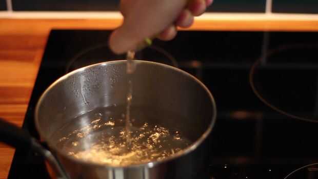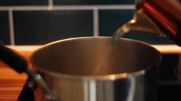 Empezar por llevar un hervidor de agua a hervir - apenas más rápido que esperando el agua a hervir en la encimera. Con una gran bandeja de fondo pesada baja a fuego medio, vierte el agua. Desea el agua para ser a fuego lento, no a burbujear como loco a hervir suave agradable.