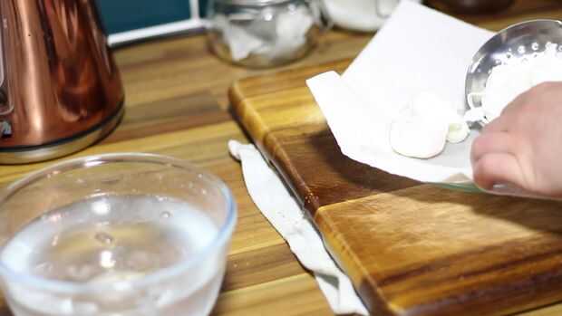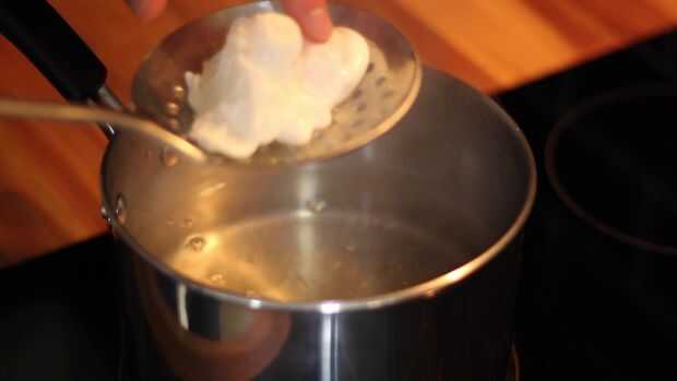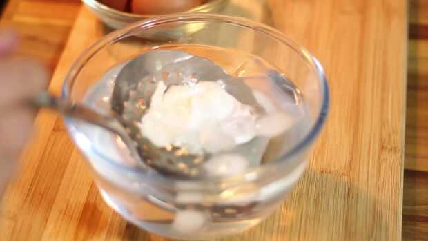 Compruebe huevo, tomando hacia fuera el agua con una espumadera, con el dedo Presione suavemente la yema de huevo - no muy fuerte aunque no desea romper. Cuando el huevo esté apenas tierno y ofrece una pequeña resistencia, blanco por todas partes está listo. Usted sabrá cuando se hace solo al tocarla - cocina trata de sentir lo que está haciendo.