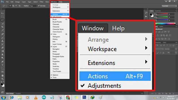 Paso 3: Seleccione Window→Actions (o) Press(Alt+F9)