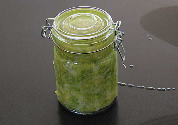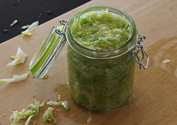 La tecla a hacer lotes pequeños sauerkraut es utilizar un tarro de boca ancha con una bala de goma Junta y alambre.