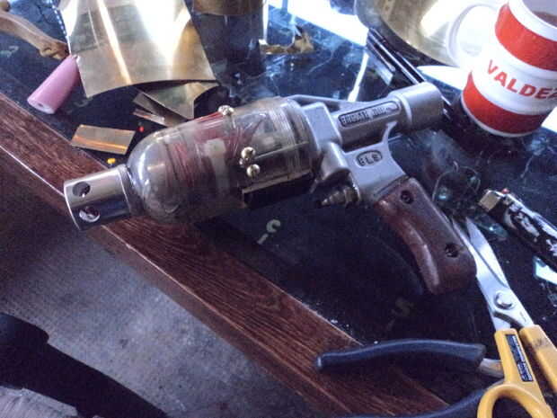 - La parte trasera de la pistola era sólo un tubo hueco y necesita a algún tipo de medio de la fijación en lo que quiere la carga en la pistola, ya sea de tus votos matrimoniales, un láser o ambos tal vez. La solución más simple era hacer un agujero a través de la pistola, bisecan el tubo. E introduciendo un pasador de chaveta de estilo. En este punto la pistola era más o menos completa, todos aunque el latón nuevo era demasiado brillante, necesitan envejecimiento - siguiente paso!