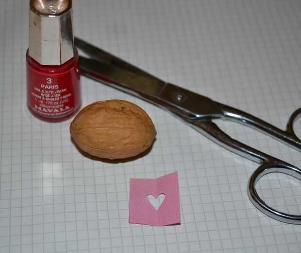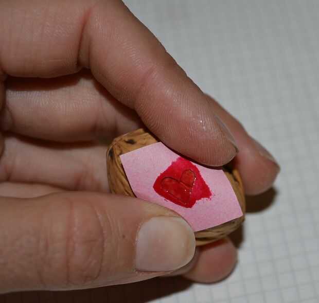 Hacer un pequeño corazón rojo en la nuez. Cortar un corazón en un pequeño trozo de papel (doblez del papel a la mitad y cortar una forma de gota). Pintar el agujero con un barniz rojo. (Sugiero para hacer probar unos sobre otro nogal antes).