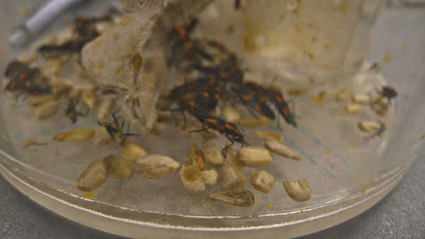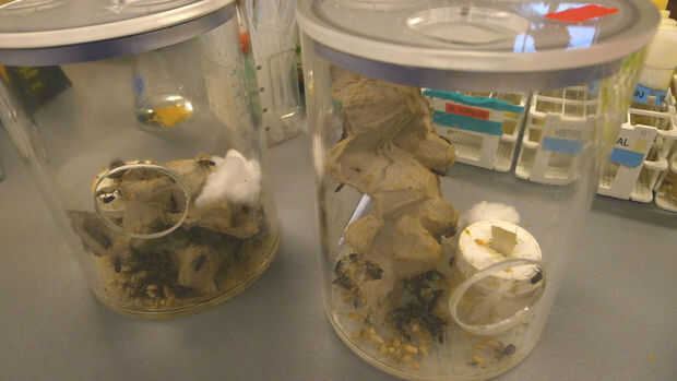 El cuidado de los bichos era simple: comen semillas de girasol crudas y beber el agua de un pequeño recipiente con una mecha. Ponemos cajas de huevo en allí para que tengan algo para subir todo y mate en. Como algunas bolas de algodón para poner sus huevos en el. Haz limpiados hacia fuera una vez por semana, y Caitlin tenía una colonia que va dentro de un mes.