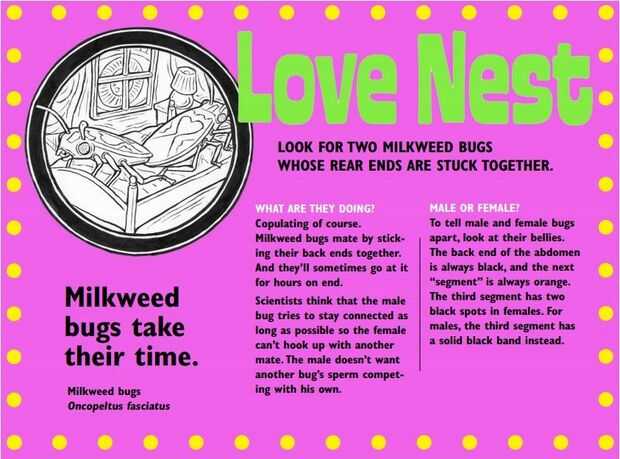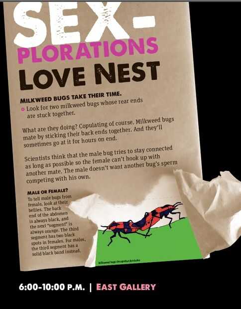 Más un par más por errores de algodoncillo es cuando se aparean, permanecen acoplados durante mucho tiempo (yo no he programado lo todavía!) y es relativamente fácil distinguir machos de hembras. El texto, escrito por el escritor de ciencia personal Kevin Boyd, explicó estas características para los visitantes. La primera versión del gráfico fue diseñada por Mark McGowan con ilustraciones de Tom Betthauser, y la segunda versión fue diseñada por Ray Larsen.